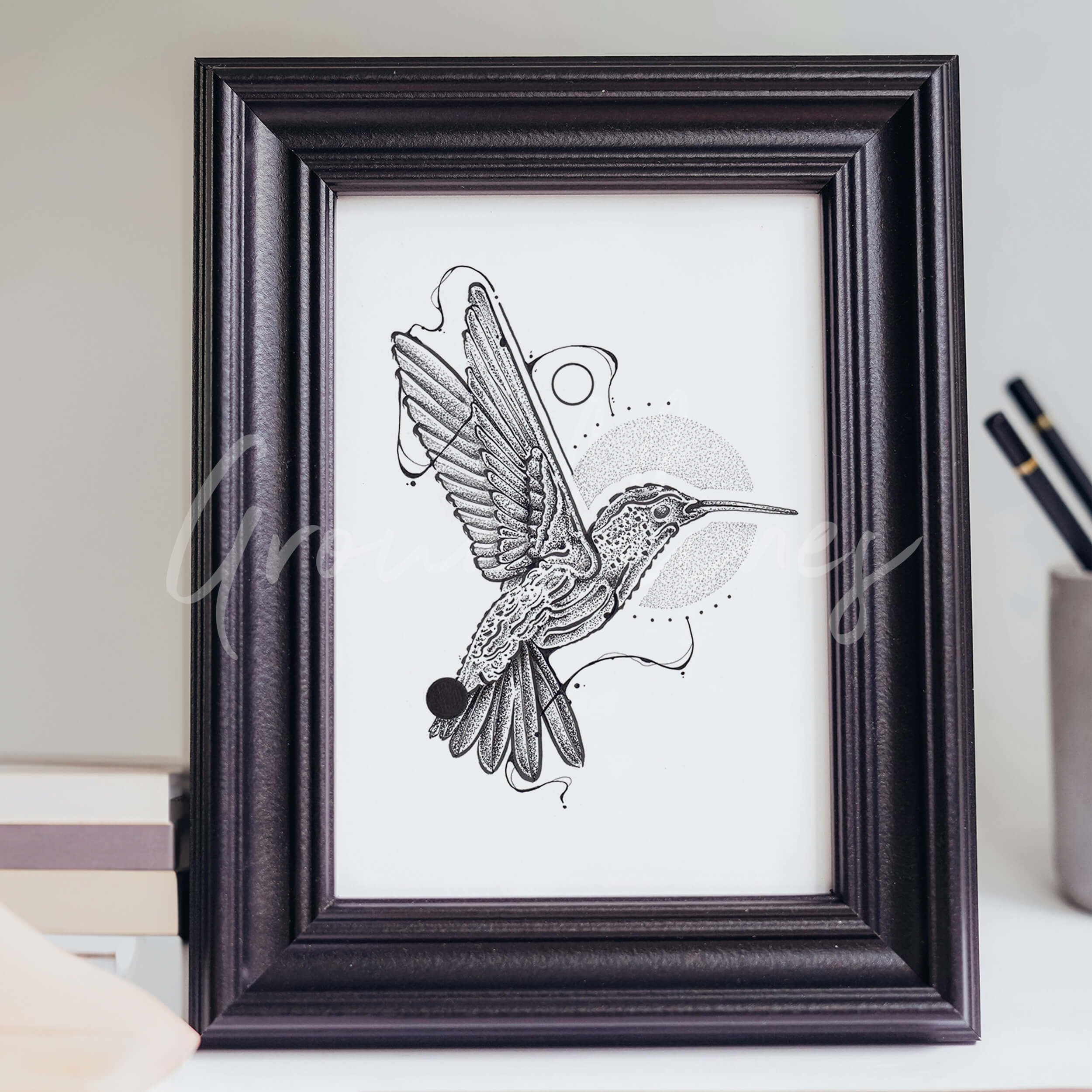 Deze unieke print is gebaseerd op een handgemaakte tekening in een combinatie van technieken: een abstracte vogel met dotwork en geometrische elementen. Gedrukt op stevig 300 grams off-white papier met een subtiel zichtbare structuur. De A5-print is geschikt om in te lijsten. Gesigneerd en genummerd in gelimiteerde oplage. Bekijk ook andere prints in dezelfde stijl!