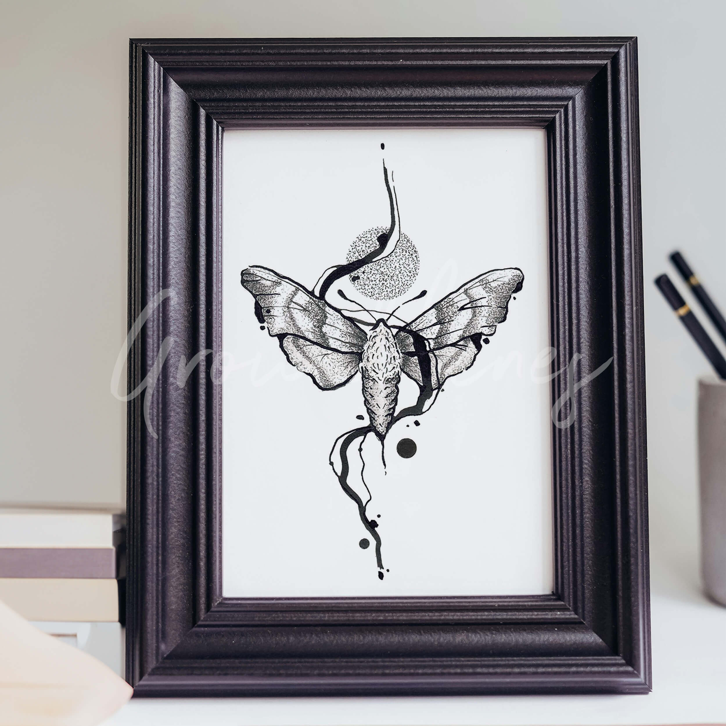 Deze unieke print is gebaseerd op een handgemaakte tekening in een combinatie van technieken: een abstracte mot met dotwork en geometrische elementen. Gedrukt op stevig 300 grams off-white papier met een subtiel zichtbare structuur. De A5-print is geschikt om in te lijsten. Gesigneerd en genummerd in gelimiteerde oplage. Bekijk ook andere prints in dezelfde stijl!