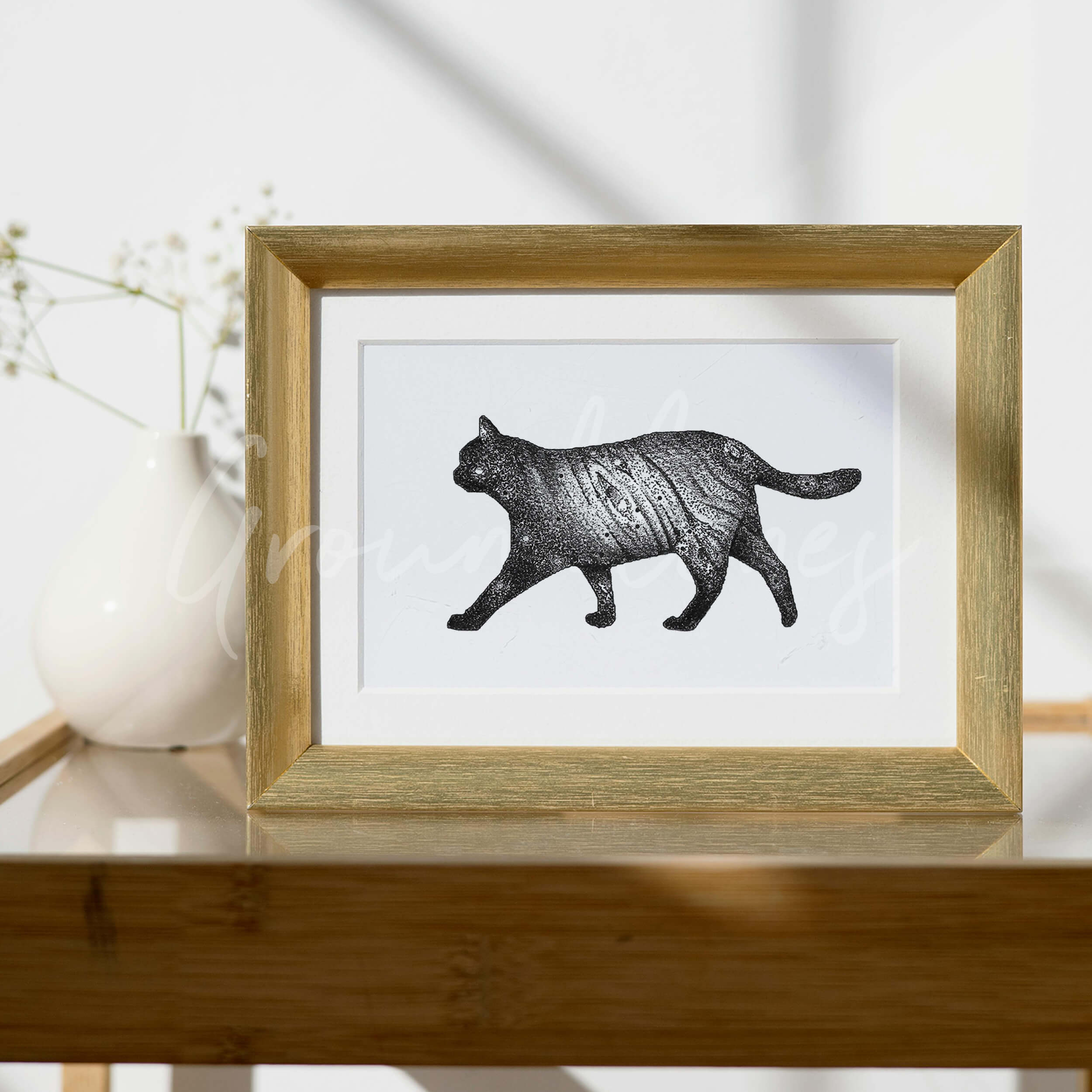 Deze unieke print is gebaseerd op een handgemaakte tekening in dotwork: een silhouette van een kat met galaxy elementen. Gedrukt op stevig wit papier (300 gr) met een subtiel matte finish. De A5-print is geschikt om in te lijsten. Gesigneerd en genummerd in gelimiteerde oplage. Bekijk ook andere prints in dezelfde stijl!