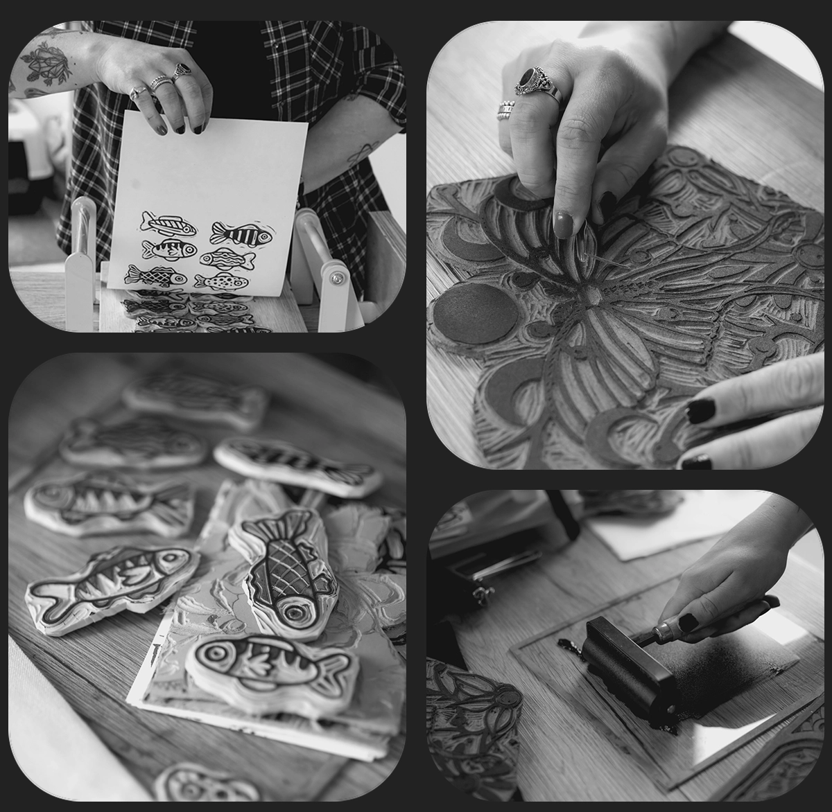 Naast mijn werk als tatoeëerder organiseer ik ook regelmatig creatieve workshops! Op een vaste locatie of gewoon bij jou thuis met een fijne club mensen. De workshops zijn ingericht rondom linostempels: een techniek waarbij je met kleine gutsjes in zacht materiaal een eigen stempel creëert. We gaan aan de slag met het maken van stempels, verschillende materialen, ontdekken toepassingen of zelfs met het ontwerpen van jouw eigen tattoo! Ontdek alle mogelijkheden en voordelen van deze creatieve workshops en wie weet keer je huiswaarts met een nieuwe favoriete hobby.